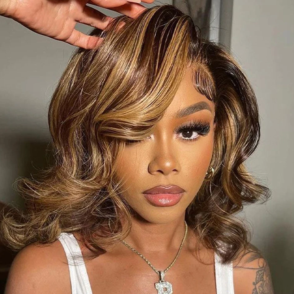 Short Loose Body Wave Glueless 6×5 Lace Wig Bouncy Curls Highlight 4/27 Honey Blonde Color